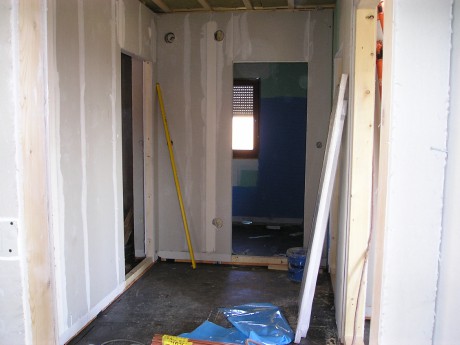Chodba mezi kuchyní a koupelnou, pohled od kuchyně.