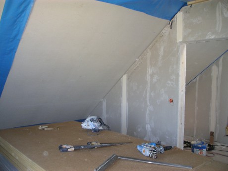 Tohle je neopakovatelný pohled, stojím totiž při focení ve sprchovém koutě, zatím je tam průchozí díra mezi koupelnou a ložnicí, ale nakonec tam bude stěna, jak jinak? Bereme návrhy na umístění postele ;)