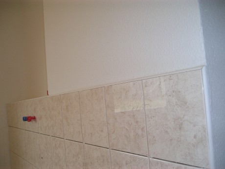 Pokus o vyfocení obkladu, bude na něm technické umyvadlo a pračka, Fotka je focená naslepo, kvůli čerstvě nalepené dlažbě. Chybí ještě soklík na odkladačce.
