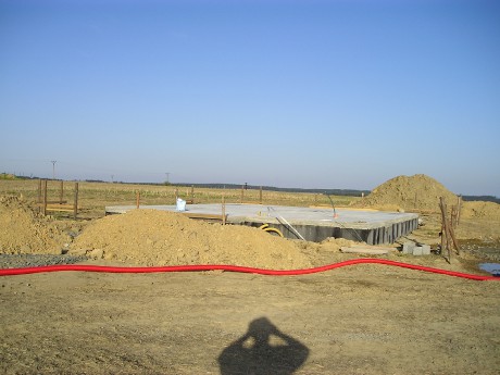 Pohled od nájezdu na desku, je vidět rozkopaný terén a taky červenou chráničku na elektřinu.