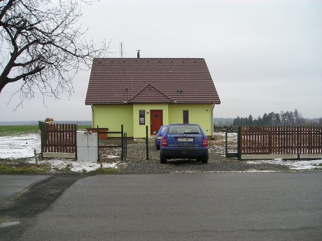 Pokhled na dům, je patrno, že chybí ještě brána, branka, sloupek od branky, ještě přijeli dobetonovat, protože se vyklal.